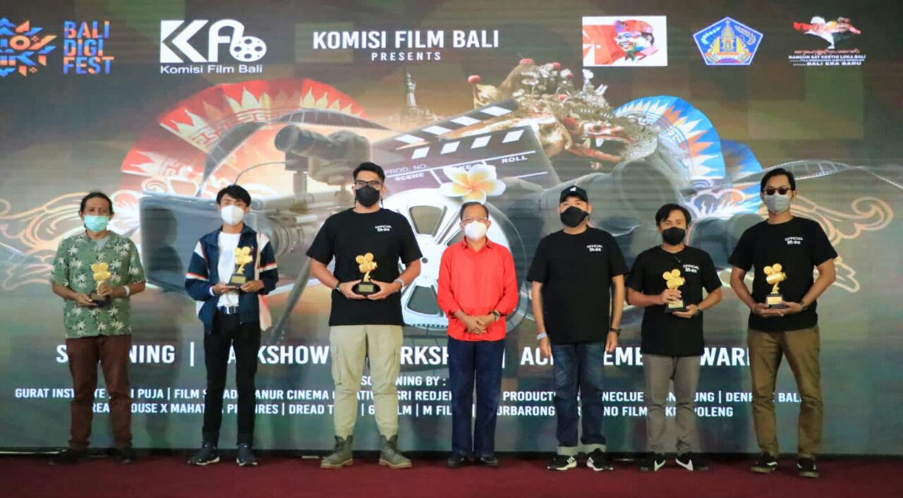 Mengakhiri kunjungannya di Bali DIGIFEST, Gubernur Bali, Wayan Koster menyerahkan penghargaan bersama Komisi Film Bali kepada generasi muda yang berprestasi diajang Film Lokal Bali.(CF/HpB)
