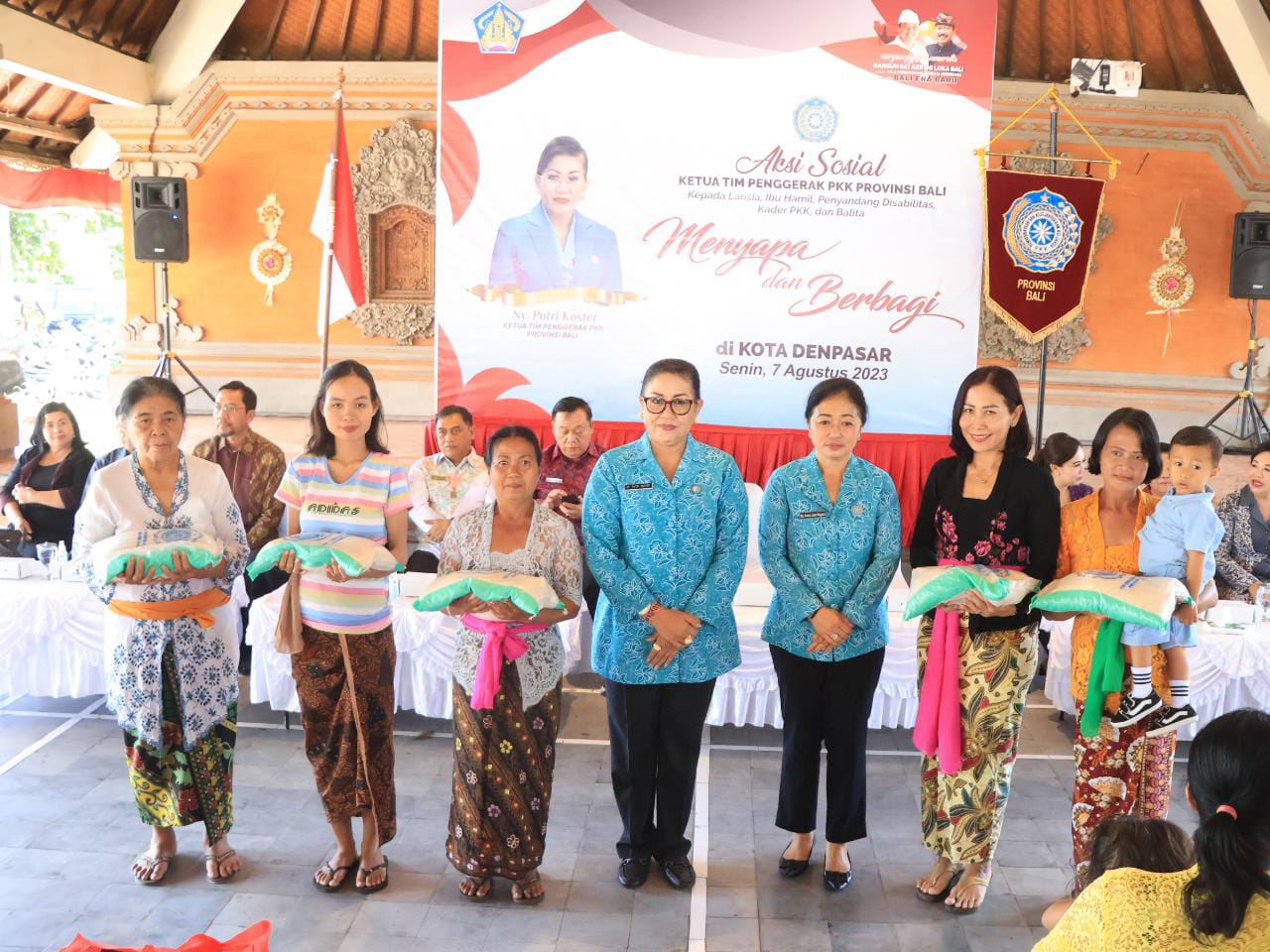 Di setiap lokasi, Ketua TP PKK Provinsi Bali Ny. Putri Suastini Koster menyerahkan bantuan kepada 50 warga sasaran. Bantuan yang diserahkan berupa 1 ton beras, 50 krat telur 80 kotak susu untuk balita, 80 kotak susu untuk lansia, ibu hamil, penyandang disabilitas dan Kader PKK. Selain itu, diserahkan pula bantuan berupa bibit tanaman produktif dari Dinas Lingkungan Hidup dan Kehutanan Provinsi Bali, bantuan bibit ayam beserta pakan dan bibit sayur mayur dari Dinas Pertanian dan Tanaman Pangan Provinsi Bali, paket makanan tambahan dan susu dari Dinas Kesehatan dan IBI Provinsi Bali. Khusus di lokasi pertama yaitu Desa Adat Taman Poh Manis, kegiatan aksi sosial dihadiri Ketua Dewan Penasehat Persatuan Istri Pegawai Bank Indonesia (PIPEBI) Ny. Ririn Perry Warjiyo yang menyerahkan bantuan sosial untuk masyarakat Desa Penatih yang diterima secara simbolis oleh Ketua TP PKK Kota Denpasar Sagung Antari Jaya Negara.