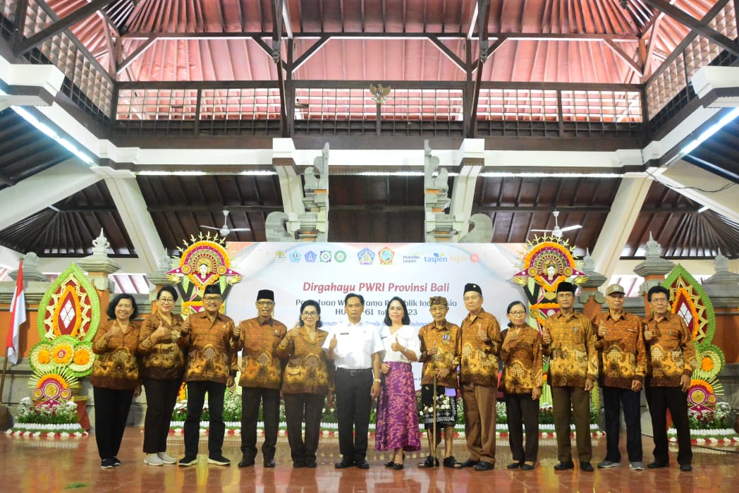 BALIPUSTAKANEWS, DENPASAR – Pj. Gubernur Bali SM Mahendra Jaya yang diwakili oleh Asisten Administrasi Umum Setda Provinsi Bali I Dewa Putu Sunartha mengapresiasi kiprah Persatuan Wredatama Republik Indonesia (PWRI) yang berkontribusi untuk pembangunan Bali. Hal itu disampaikannya saat Puncak Ulang Tahun ke-61 PWRI tahun 2023, bertempat di Gedung Nari Graha, Denpasar, pada Rabu (20/9/2023).