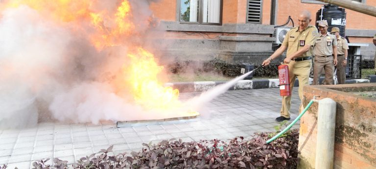 Balipustakanews.com, Denpasar – Apel Peringatan Bulan Keselamatan dan Kesehatan Kerja (K3) Tahun 2024 digelar di Halaman Kantor Dinas Ketenagakerjaan dan Energi Sumber Daya Mineral, Senin (22/1). Kadisnaker dan ESDM Bali Ida Bagus Setiawan bertindak sebagai inspektur dalam apel tersebut. Peringatan Bulan K3 juga diisi dengan demo pemadaman kebakaran dengan media APAR (Alat Pemadam Api Ringan). Kadisnaker dan ESDM Bali Ida Bagus Setiawan dan sejumlah pegawai secara bergantian mempraktikkan cara pemadaman api dengan menggunakan APAR.
