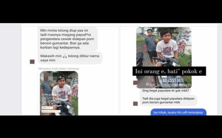 “Min minta tolong di-up yaa ini tadi masnya megang payud*ra pengendara cewek di depan pom bensin Gumantar. Biar ga ada korban lagi kedepannya,” tulis seorang pengguna akun Facebook kepada admin @ICWS_infocegatanwilayahsragen.