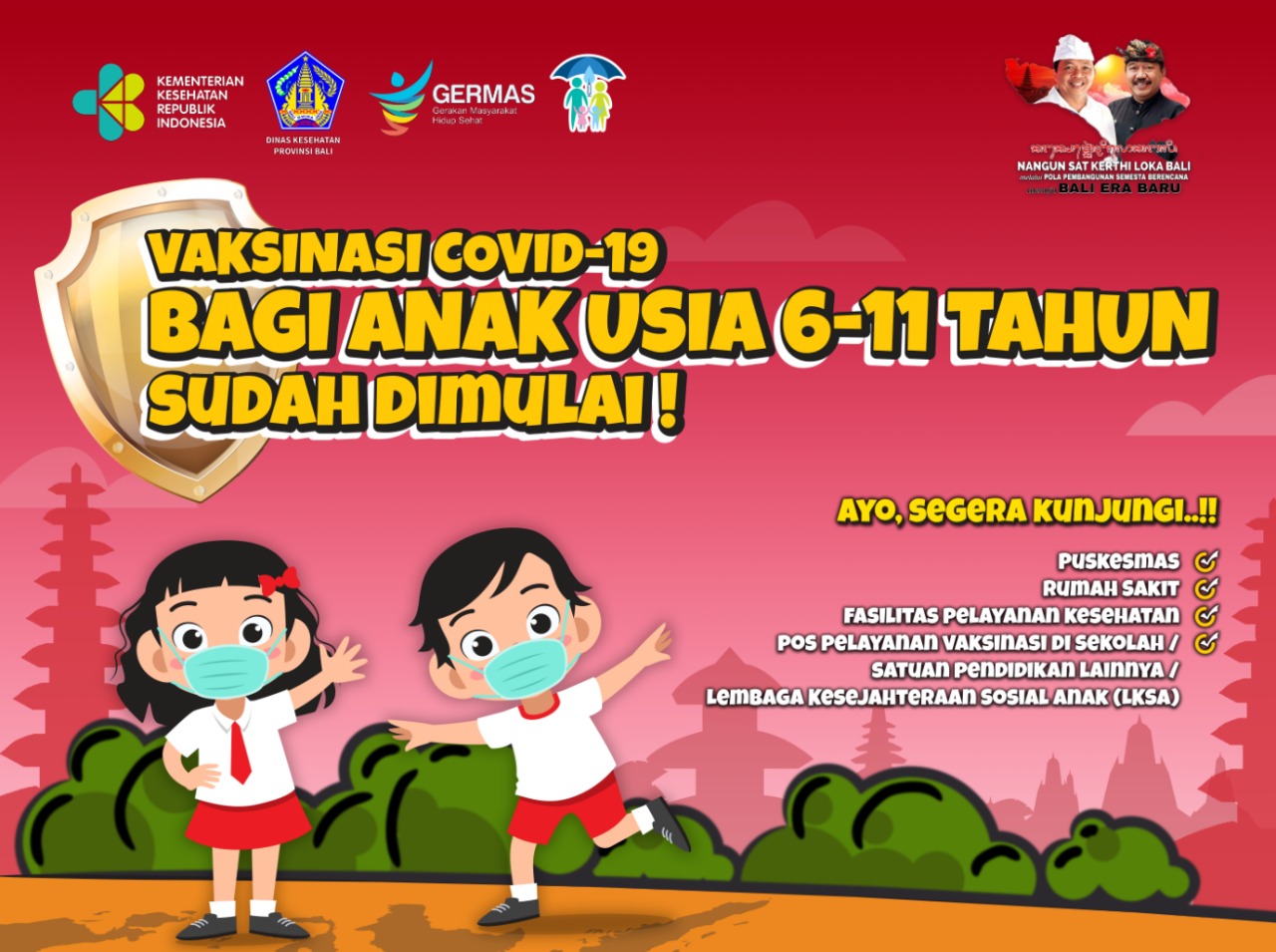 Provinsi Bali jadi salah satu provinsi yang akan menjalankan kick off vaksinasi anak bersama Banten, DI Yogyakarta, DKI Jakarta, Jawa Barat, Jawa Tengah, Jawa Timur, Kalimantan Timur, Kepulauan Riau, Nusa Tenggara Barat dan Sulawesi Utara. Hal ini disampaikan Kepala Dinas Komunikasi Informatika dan Statistik Provinsi Bali Gede Pramana dalam siaran persnya Rabu (15/12) pagi.