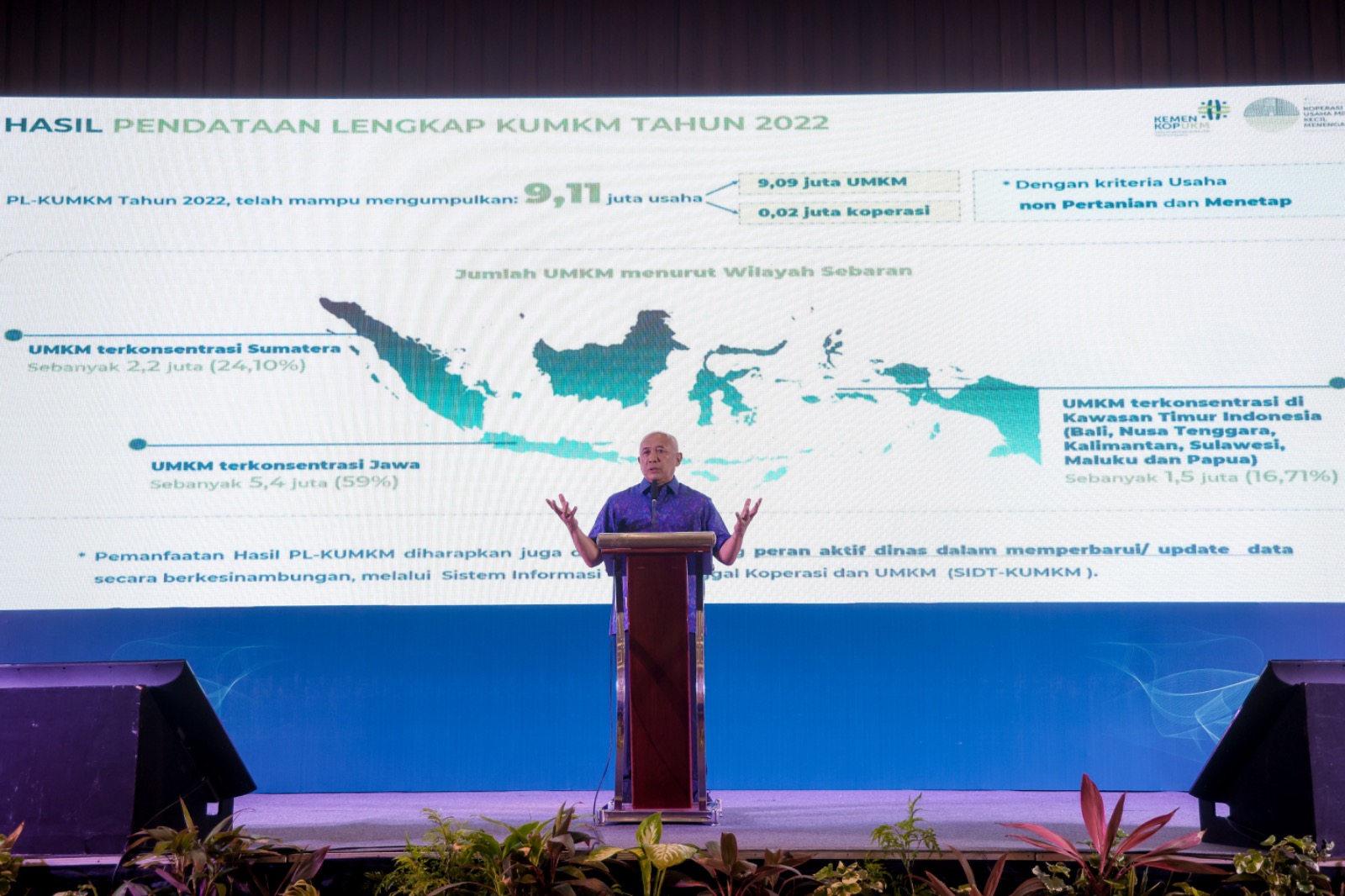 Dalam kesempatan tersebut, Menteri Koperasi UKM RI Teten Masduki mengatakan bahwa pihaknya mendorong pemanfaatan hasil pendataan lengkap koperasi dan UMKM tahun 2022 untuk membuat kebijakan yang solutif dan tepat sasaran. Tercatat, pendataan lengkap KUMKM 2022 menghasilkan sebanyak 9,11 juta usaha di Indonesia, dengan kriteria usaha non pertanian dan menetap terdiri dari 9,09 juta UMKM dan 20.000 koperasi.