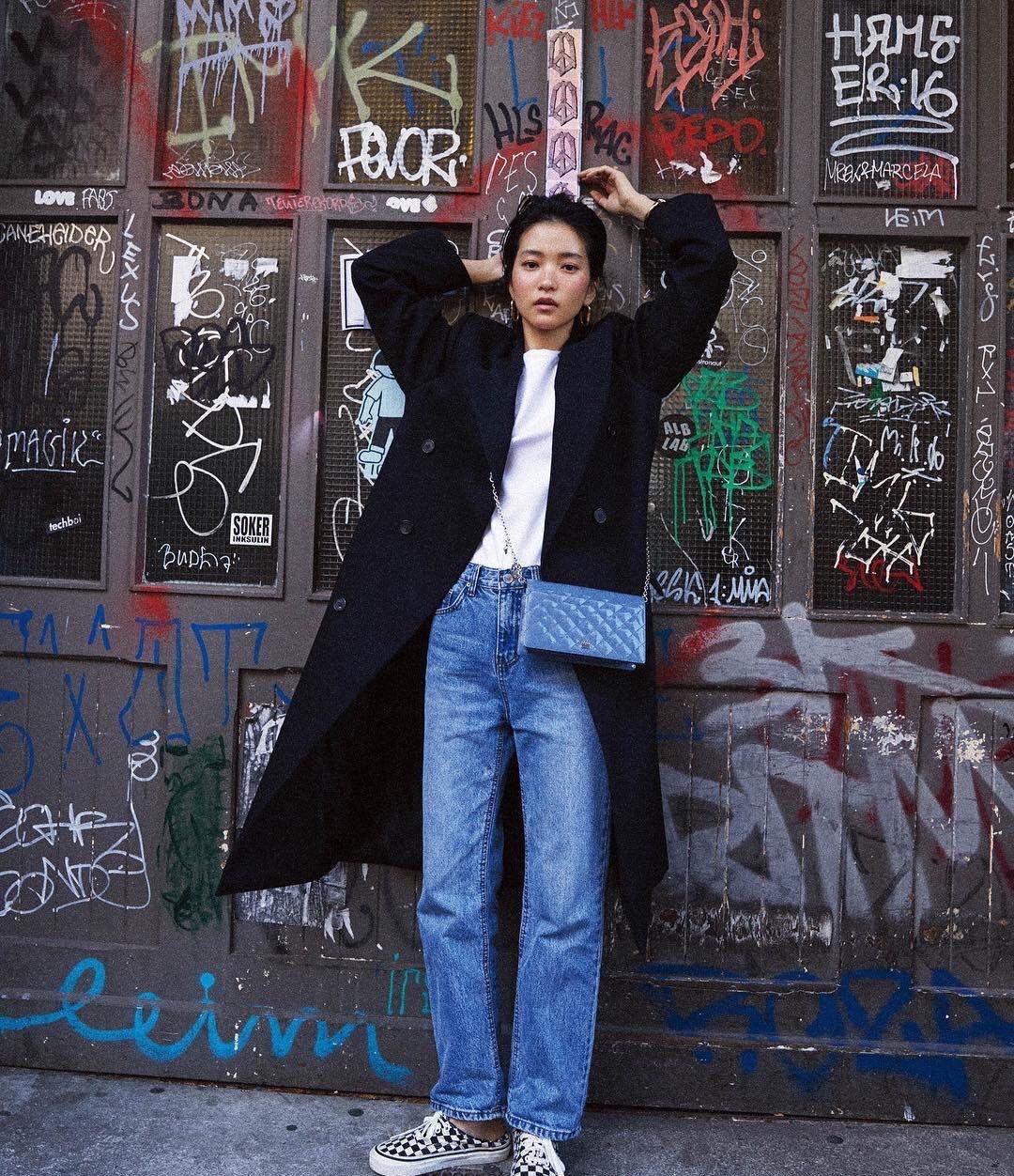 1. Celana jeans yang kasual terlihat lebih kece dengan coat hitam dan cross body bag.