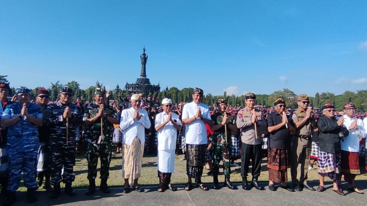 Balipustakanews.com, Denpasar – Gubernur Bali Wayan Koster bersama jajaran Forum Koordinasi Pimpinan Daerah (Forkopimda) Bali menghadiri Gelar Agung Pecalang Bali di Lapangan Niti Mandala Renon, Denpasar, Senin (1/9). Ribuan pecalang dari seluruh kabupaten/kota di Bali hadir, memenuhi lapangan dengan semangat menjaga keamanan dan ketertiban Pulau Dewata.