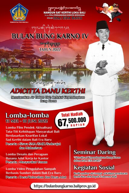 Selain itu, dilaksanakan pula Seminar Daring dengan Tema “Aktualisasi Kepemimpinan Bung Karno Dalam Bali Era Baru pada Senin, 6 Juni 2022 serta Gerakan Kebersihan Serentak sekaligus tebar benih ikan yang dilaksanakan oleh Pemerintah Provinsi Bali, Pemerintah Kabupaten/Kota, Kecamatan, Desa/Kelurahan, Desa Adat dan Tim Desa Kerthi Bali Sejahtera yang diadakan Selasa, 21 Juni 2022. Untuk Informasi lebih lengkap , dapat mengunjungi Website https://bulanbungkarno.baliprov.go.id. (CF/HpB)
