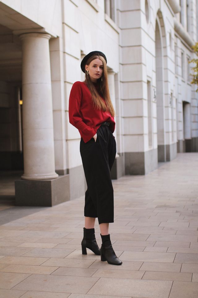 5. Tak selalu dress, pakai sweater merah ala Imlek juga bisa kamu padu-padankan dengan celana hitam selutut nih. Tambahkan topi fedora biar makin on point