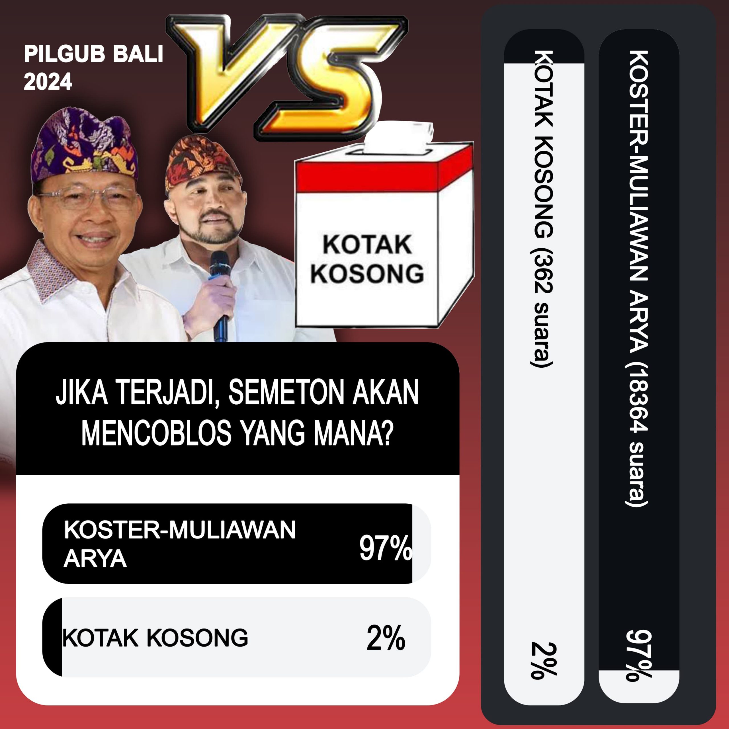 Paket itu menang atas melawan Koko alias kotak kosong. “Wayan Koster-Muliawan Arya alias De Gadjah unggul atas Koko (kotak kosong) pada polling di Instastory BJ (selama 1 hari). ‘Jika pada Pilgub Bali 2024 terjadi pasangan Koster-Mulia melawan Kotak Kosong,” begitu tulis akun Balijani__ yang dikutip, Jumat 5 Juli 2024.