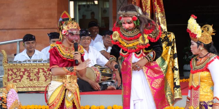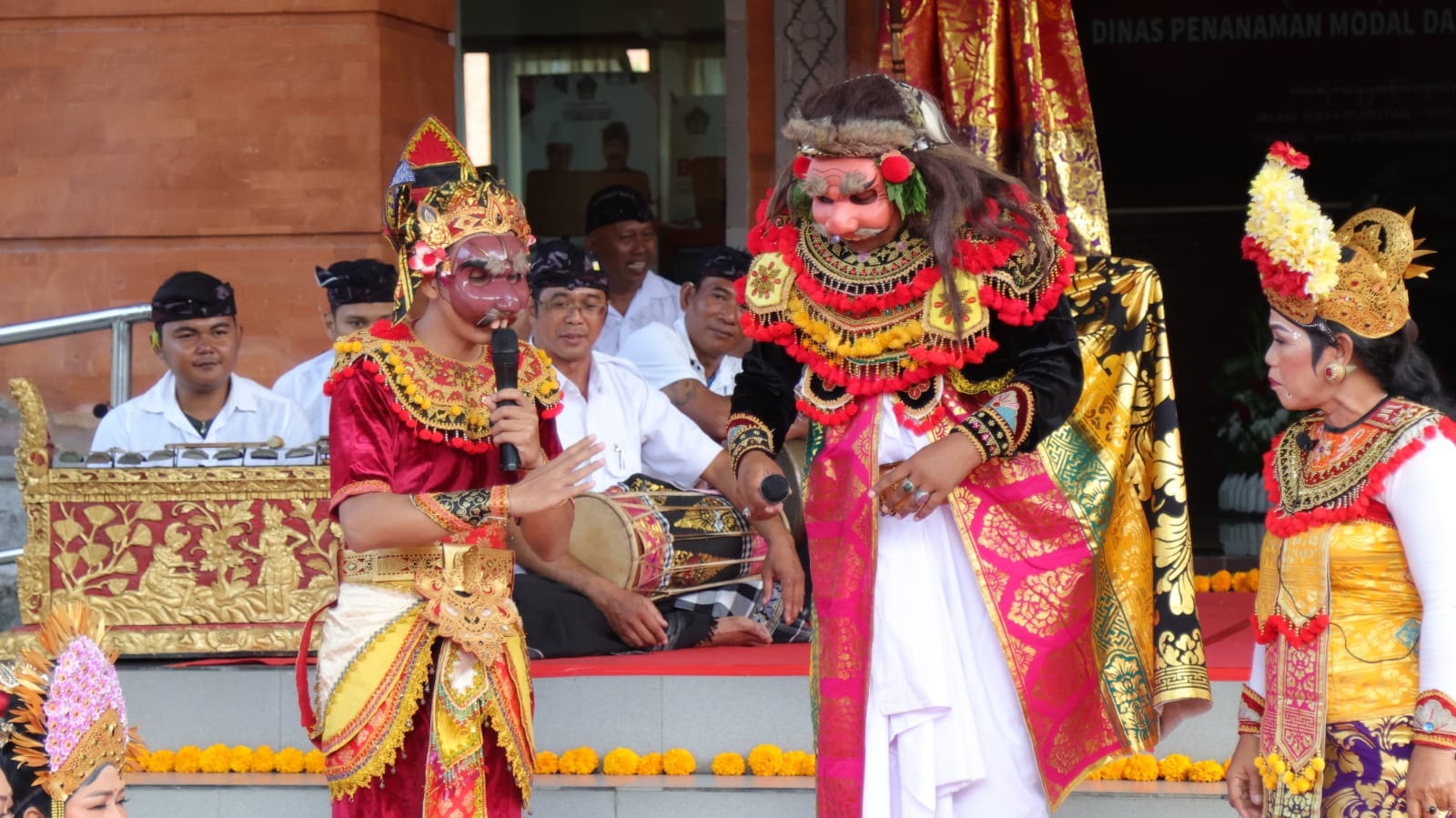 BALIPUSTAKANEWS, DENPASAR – Serangkaian Hari Raya Galungan, Kuningan dan Hari Jadi Provinsi Bali ke-65 serta HUT Kemerdekaan Republik Indonesia ke-78, Dinas Penanaman Modal Perizinan Terpadu Satu Pintu (DPMSTP) Provinsi Bali menggelar sosialisasi perizinan melalui pementasan budaya jejangeran, di Halaman Kantor DPMPTSP Provinsi Bali, Kamis (10/8).