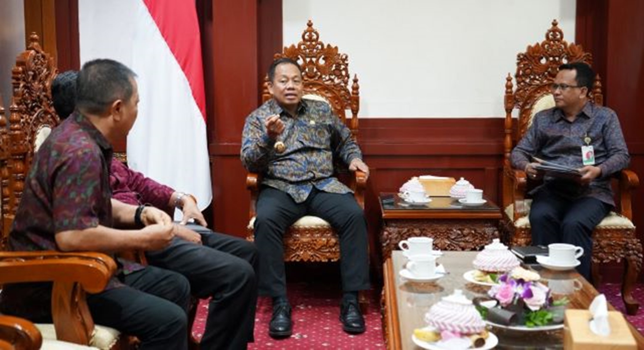 BALIPUSTAKANEWS, DENPASAR – Pj. Gubernur Bali S.M. Mahendra Jaya didampingi Asisten Bidang Perekonomian dan Pembangunan Sekda Provinsi Bali I Wayan Serinah, Kepala Badan Pendapatan Daerah Provinsi Bali I Made Santha dan Kepala Dinas Kebudayaan Provinsi Bali Prof Dr I Gede Arya Sugiartha menerima Direktur Utama BPD Bali I Nyoman Sudharma, Selasa (24/10/2023).