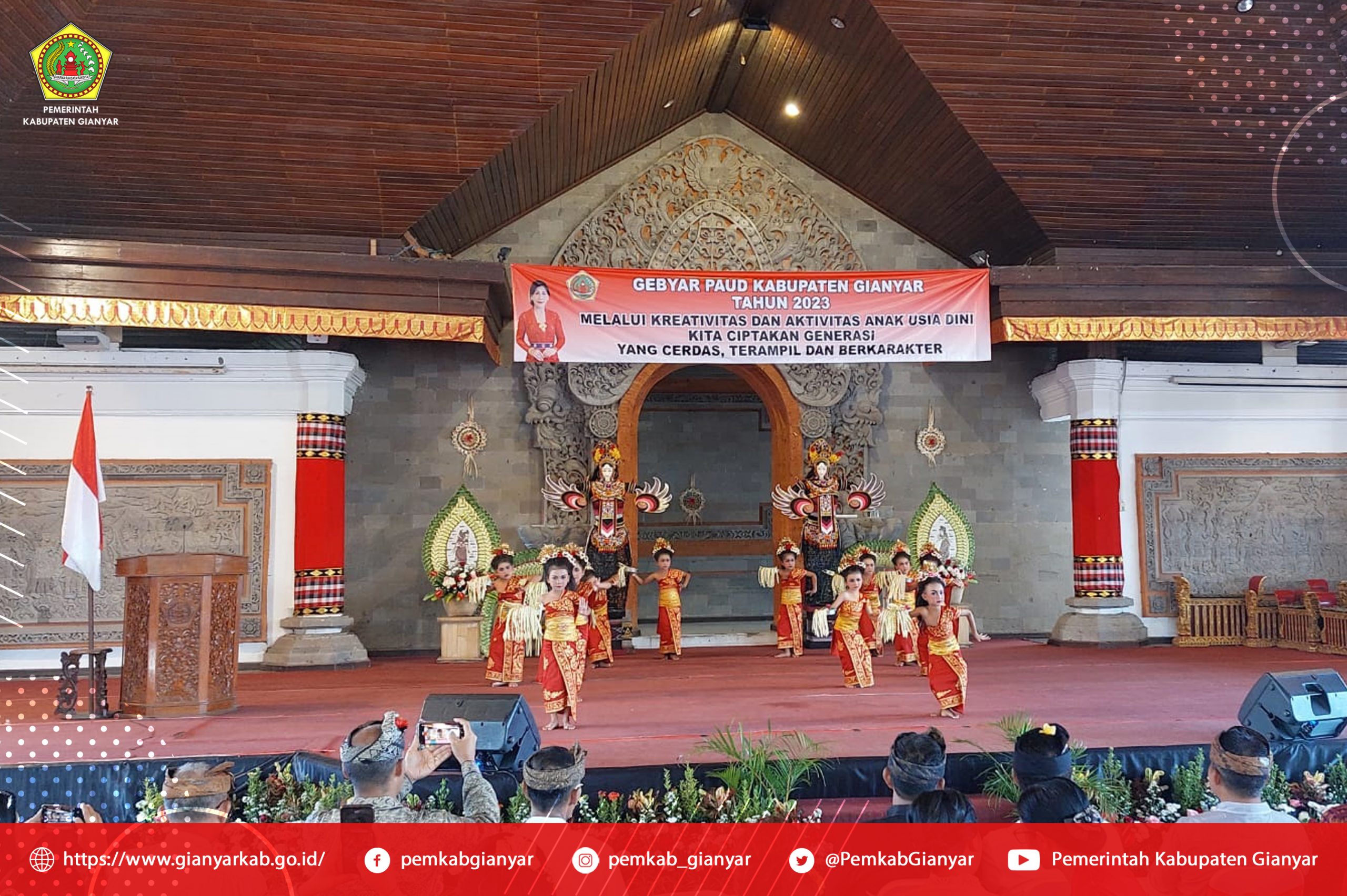 Acara diawali dengan penampilan parade drum band dari anak-anak TK. Santa Maria Ratu Rosari Gianyar, dilanjutkan dengan parade TK. Kemala Bayangkari 4 Gianyar dan TK. Kartika VII-6 Gianyar yang membawa bendera merah putih, panji-panji dan lambang NKRI serta parade ogoh-ogoh dan baleganjur dari TK. Negeri Mutiara Gianyar di Open Stage Balai Budaya Gianyar.