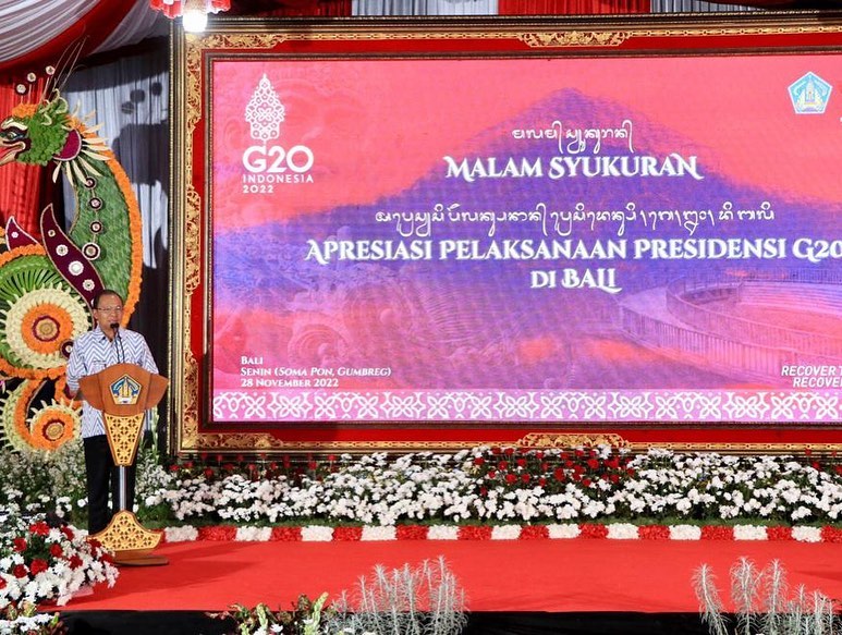 Ucapan terimakasih tersebut disampaikan pada, Senin, 28 November 2022 malam di Jayasabha dalam acara syukuran apresiasi Presidensi G20. “Presidensi G20 telah memberikan manfaat kepada Bali, mulai dari adanya pembangunan dan penataan infrastruktur, meningkatnya kunjungan wisatawan ke Bali, karena pariwisatanya semakin berkualitas, serta cepatnya pemulihan pertumbuhan ekonomi Pulau Bali. Atas hal ini kita harus syukuri,” kata Gubernur Bali asal Desa Sembiran, Buleleng ini yang disambut tepuk tangan.(TA/HpB)