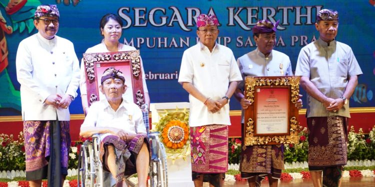 BALIPUSTAKANEWS, DENPASAR – Gubernur Bali, Wayan Koster bersama Wakil Gubernur Bali, Tjokorda Oka Artha Ardana Sukawati dan Kepala Dinas Kebudayaan Provinsi Bali, Gede Arya Sugiartha memberikan Penganugerahan Bali Kerthi Nugraha Mahottama Tahun 2023 kepada masyarakat Bali yang telah berjasa selama hidupnya melestarikan Bahasa, Sastra dan Aksara Bali.