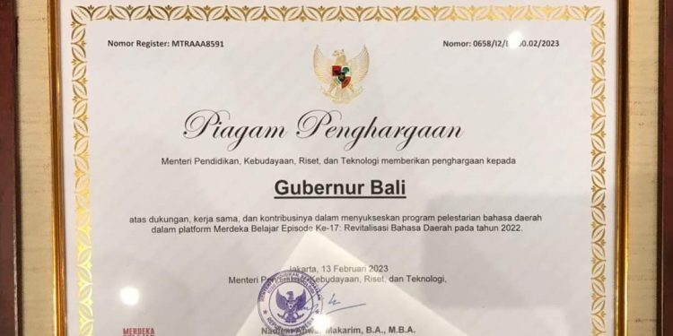 BALIPUSTAKANEWS, JAKARTA – Gubernur Bali, Wayan Koster meraih penghargaan nasional dibidang Pelestarian Bahasa Daerah dari Menteri Pendidikan, Kebudayaan, Riset, dan Teknologi Republik Indonesia, Nadiem Anwar Makarim pada Senin (Soma Kliwon, Krulut) tanggal 13 Februari 2023 di Jakarta.