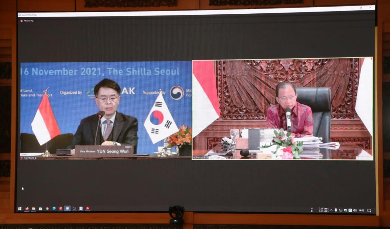 BALIPUSTAKANEWS,DENPASAR – Gubernur Bali, Wayan Koster menghadiri pertemuan bilateral tingkat tinggi dengan Wakil Menteri Pertanahan, Infrastruktur dan Transportasi Korea, Yoon Sung-won secara virtual pada, Selasa (Anggara Umanis, Kuningan) 16 Nopember