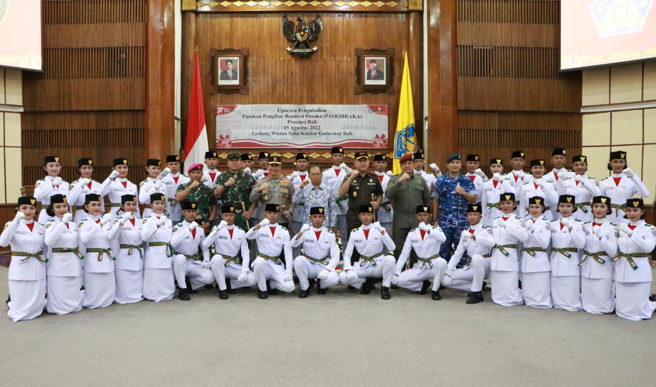 BALIPUSTAKANEWS,DENPASAR – Gubernur Bali Wayan Koster mengukuhkan Pasukan Pengibar Bendera Pusaka (Paskibraka) Provinsi Bali Tahun 2022 di Gedung Wiswa Sabha Utama Kantor Gubernur Bali, Senin (Soma Pon Matal) 15 Agustus 2022.