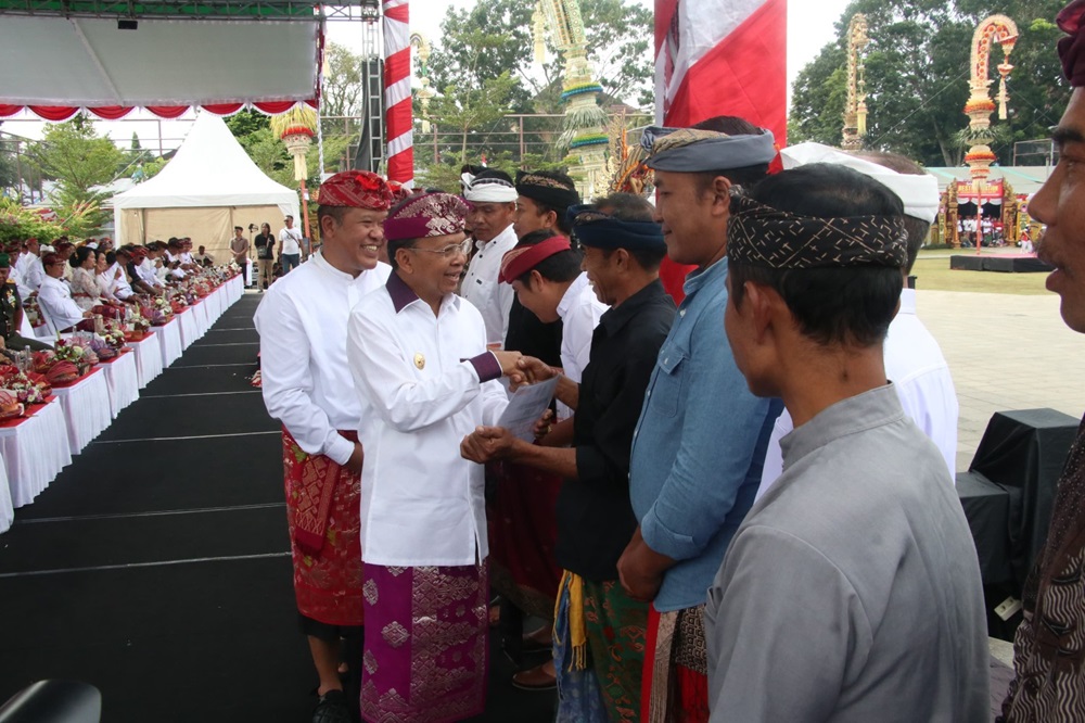 Selanjutnya, Gubernur Bali didampingi Bupati Bangli Sang Nyoman Sedana Arta secara langsung menyerahkan bantuan secara simbolis kepada para penerima dari berbagai latar belakang, mulai dari rumah warga, tempat ibadah, fasilitas umum, hingga sarana perekonomian. Kehadiran mereka di tengah acara menjadi bukti nyata bahwa semangat gotong royong masih hidup di tengah masyarakat Bali.