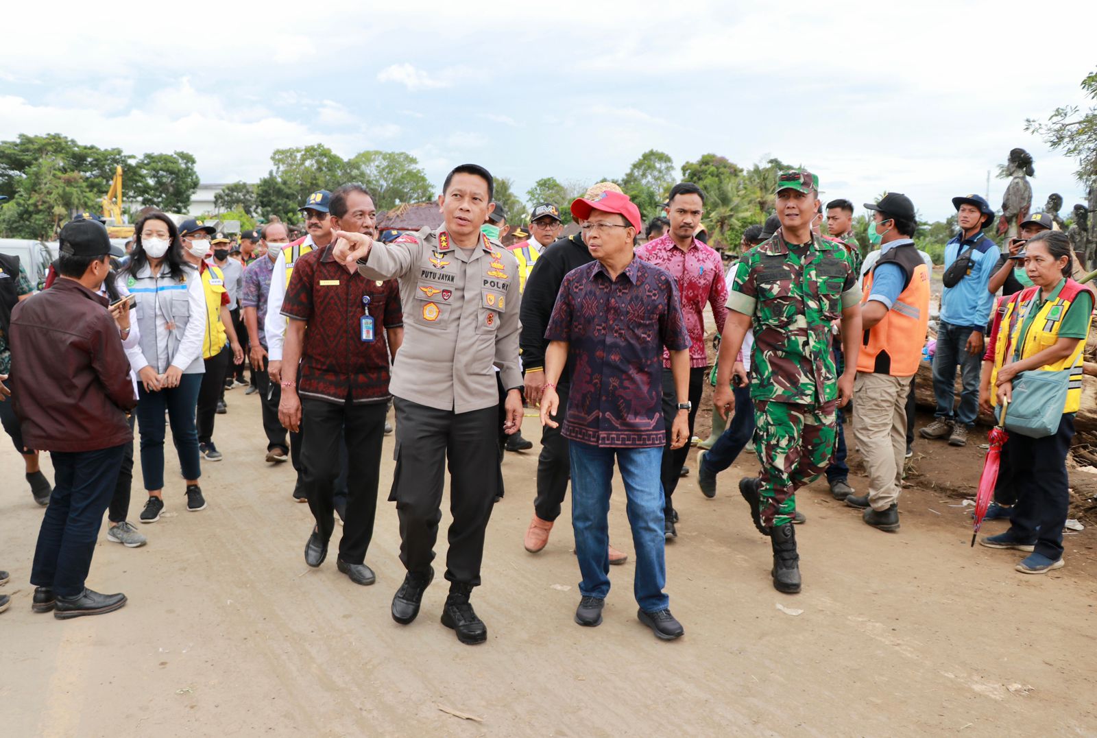 BALIPUSTAKANEWS,DENPASAR – Gubernur Bali, Wayan Koster bersama Kapolda Bali, Irjen Pol Putu Jayan Danu Putra dan didampingi Bupati Jembrana, Nengah Tamba meninjau langsung lokasi bencana banjir di Jembatan Bilukpoh serta Posko Penampungan Warga Terdampak Banjir di Kelurahan Tegalcangkring dan di Desa Penyaringan, Kecamatan Mendoyo, Kabupaten Jembrana, pada Selasa (Anggara Paing, Watugunung) 18 Oktober 2022 sore.