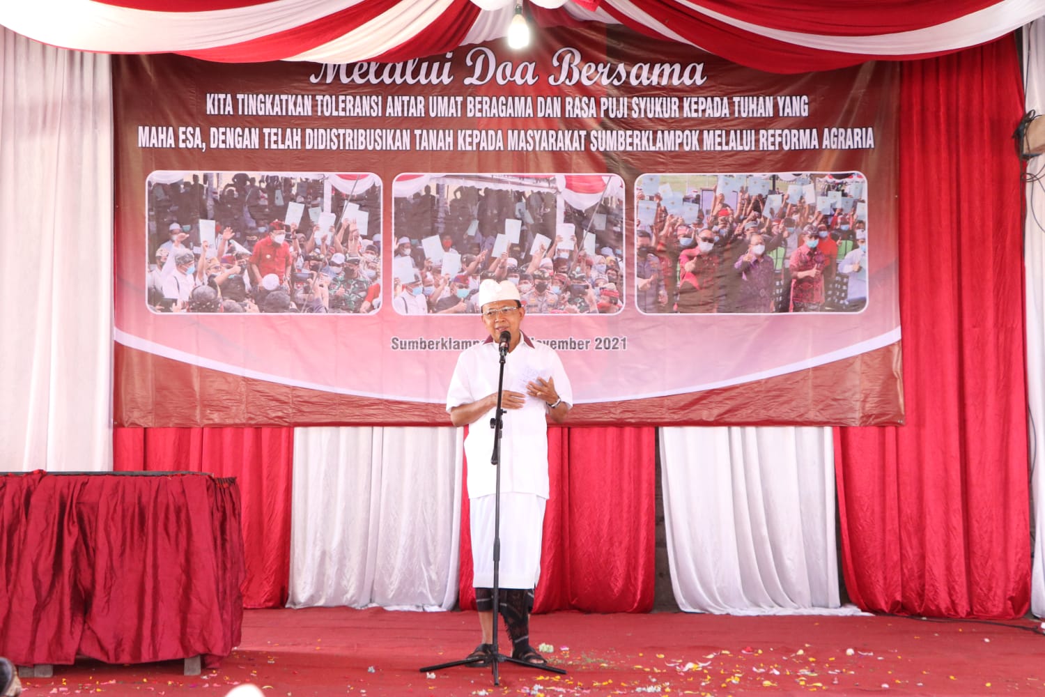 Usai melaksanakan persembahyangan Gubernur Bali dalam pidatonya berpesan kepada warga Desa Sumberklampok yang baru saja memperoleh sertifikat hak milik atas tanah, agar bisa memanfaatkan lahan tersebut dengan baik. “Jangan digadaikan. Buat lahannya jadi produktif yang mampu memberikan kesejahteraan,” pesan Gubernur Bali asal Desa Sembiran, Buleleng ini seraya menyampaikan rasa syukur karena dengan ketulusan, ketegasan dan butuh keberanian, persoalan tanah di Sumberklampok yang sudah terjadi bertahun-tahun hingga 6 periode di kepemimpinan Gubernur di Bali hingga membuat masyarakat Desa sekian kali melakukan perjuangan ke tingkat Pemda serta ke Pemerintah Pusat, ternyata di dalam kepimpinan Saya menjadi Gubernur Bali, bisa terselesaikan.
