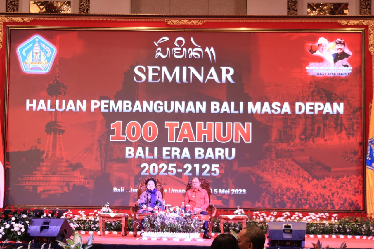 BALIPUSTAKANEWS, DENPASAR – Presiden Ke-5 Republik Indonesia, Ibu Prof. Dr. (HC), Hj. Megawati Soekarnoputri, membuka secara resmi Seminar Haluan Pembangunan Bali Masa Depan, 100 Tahun Bali Era Baru, pada hari Jumat (Sukra Umanis, Klawu), 5 Mei 2023 didampingi Gubernur Bali, Wayan Koster bersama Wakil Gubernur Bali, Tjokorda Oka Artha Ardana Sukawati yang ditandai dengan pemukulan kulkul bertempat di Hotel Trans Resort, Bali.
