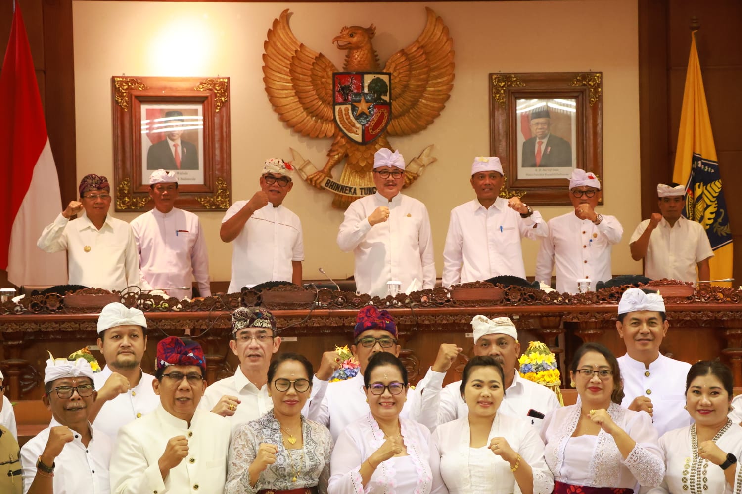 BALIPUSTAKANEWS, DENPASAR – Kepemimpinan Gubernur Bali, Wayan Koster di Pemerintah Provinsi Bali kembali menorehkan sejarah untuk Pembangunan Bali Masa Depan dengan disetujuinya Raperda Provinsi Bali tentang Haluan Pembangunan Bali Masa Depan, 100 Tahun Bali Era Baru 2025-2125 oleh Pimpinan dan seluruh Anggota DPRD Provinsi Bali untuk ditetapkan menjadi Peraturan Daerah, pada rahina Purnama Kasa, Senin (Soma Kliwon, Wariga), 3 Juli 2023 di Ruang Sidang Utama DPRD Provinsi Bali.
