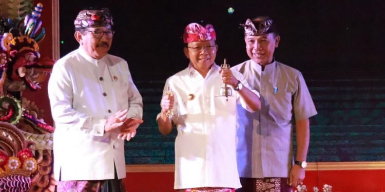 BALIPUSTAKANEWS, DENPASAR – Gubernur Bali, Wayan Koster bersama Wakil Gubernur Bali, Tjokorda Oka Artha Ardana Sukawati dan Kepala Dinas Kebudayaan Provinsi Bali, Gede Arya Sugiartha secara resmi menutup Bulan Bahasa Bali Ke-V Tahun 2023 yang bertema ‘Segara Kerthi Campuhan Urip Sarwa Prani’ ditandai dengan membunyikan suara genta yang sekaligus menjadi penanda pelaksanaan Bulan Bahasa Bali Ke-VI akan segera berlangsung di Tahun 2024 dengan tema ‘Jana Kerthi Dharma Sadhu Nuraga’ di Gedung Ksirarnawa, Art Centre Denpasar pada, Selasa (Anggara Kliwon, Tambir) 28 Februari 2023.