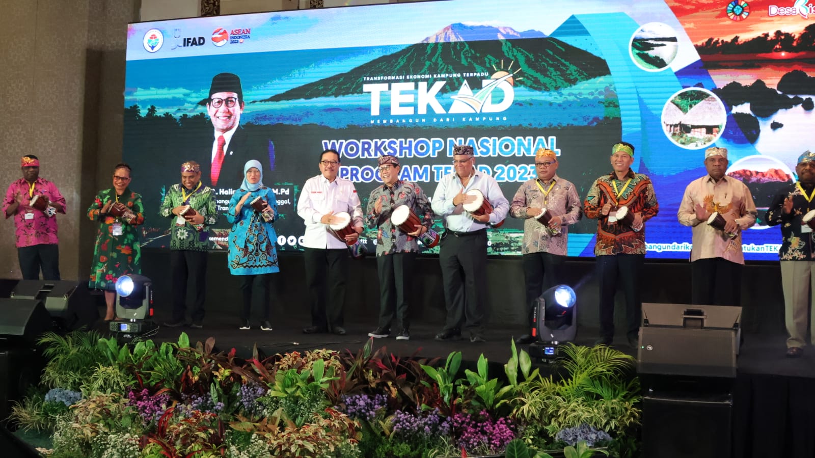 Masih dalam rangkaian pembukaan workshop, Country Director IFAD Hani Elsadani Salem menyinggung posisi strategis program TEKAD. “Ini program penting, bukan hanya bagi Indonesia namun juga untuk IFAD,” cetusnya. Oleh karena itu, ia mendukung penuh pola kemitraan dalam menyukseskan program yang bertujuan memberdayakan masyarakat di wilayah sasaran. Menurutnya, salah satu yang menjadi penekanan pada program ini adalah upaya mengurangi kesenjangan antar wilayah di Indonesia. Pembukaan workshop ditandai dengan pemukulan jimbe oleh Mendes PDTT, Wagub Cok Ace serta perwakilan dari daerah sasaran program TEKAD.