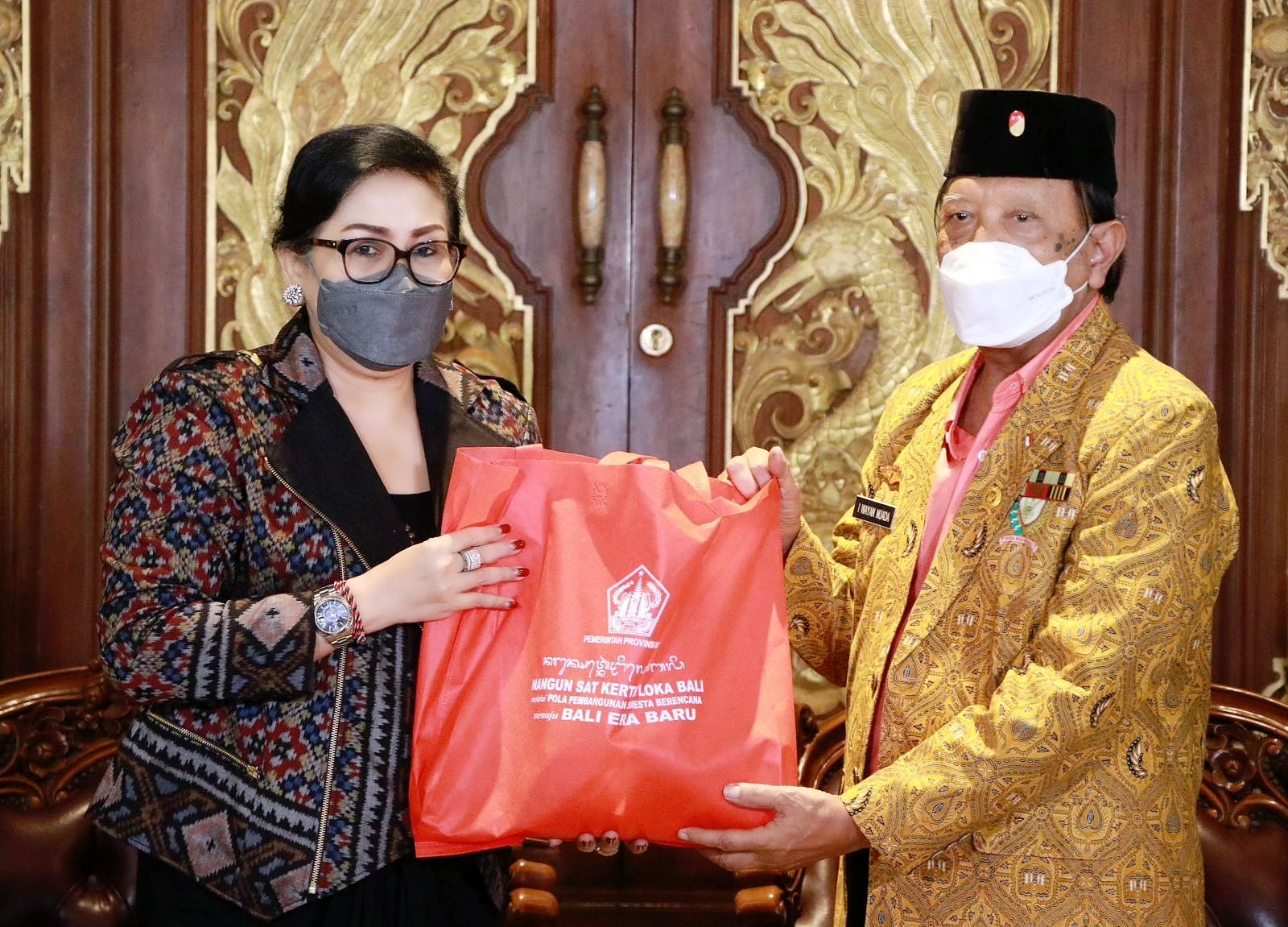 BALIPUSTAKANEWS,DENPASAR – Ketua TP PKK Provinsi Bali Ny. Putri Suastini Koster menyerahkan paket sembako kepada purnawirawan dan warakauri TNI dan POLRI yang tergabung dalam PEPABRI. Bantuan paket sembako juga diberikan kepada staf, sopir dan cleaning service yang dalam kesehariannya bertugas di sekretariat PKK, Dekranasda dan PAKIS Bali. Penyerahan bantuan paket sembako dilaksanakan di Gedung Jayasabha, Minggu (13/3/2022). Total sembako yang diserahkan berjumlah 41 paket dengan perincian, 25 paket untuk PEPABRI, 5 paket untuk Staf PKK, 7 paket untuk staf Dekranasda dan 4 paket untuk staf PAKIS Bali. Masing-masing paket berisi 25 Kg beras, 2 Kg gula pasir, 1 botol minyak tandusan dan 1 krat telur.