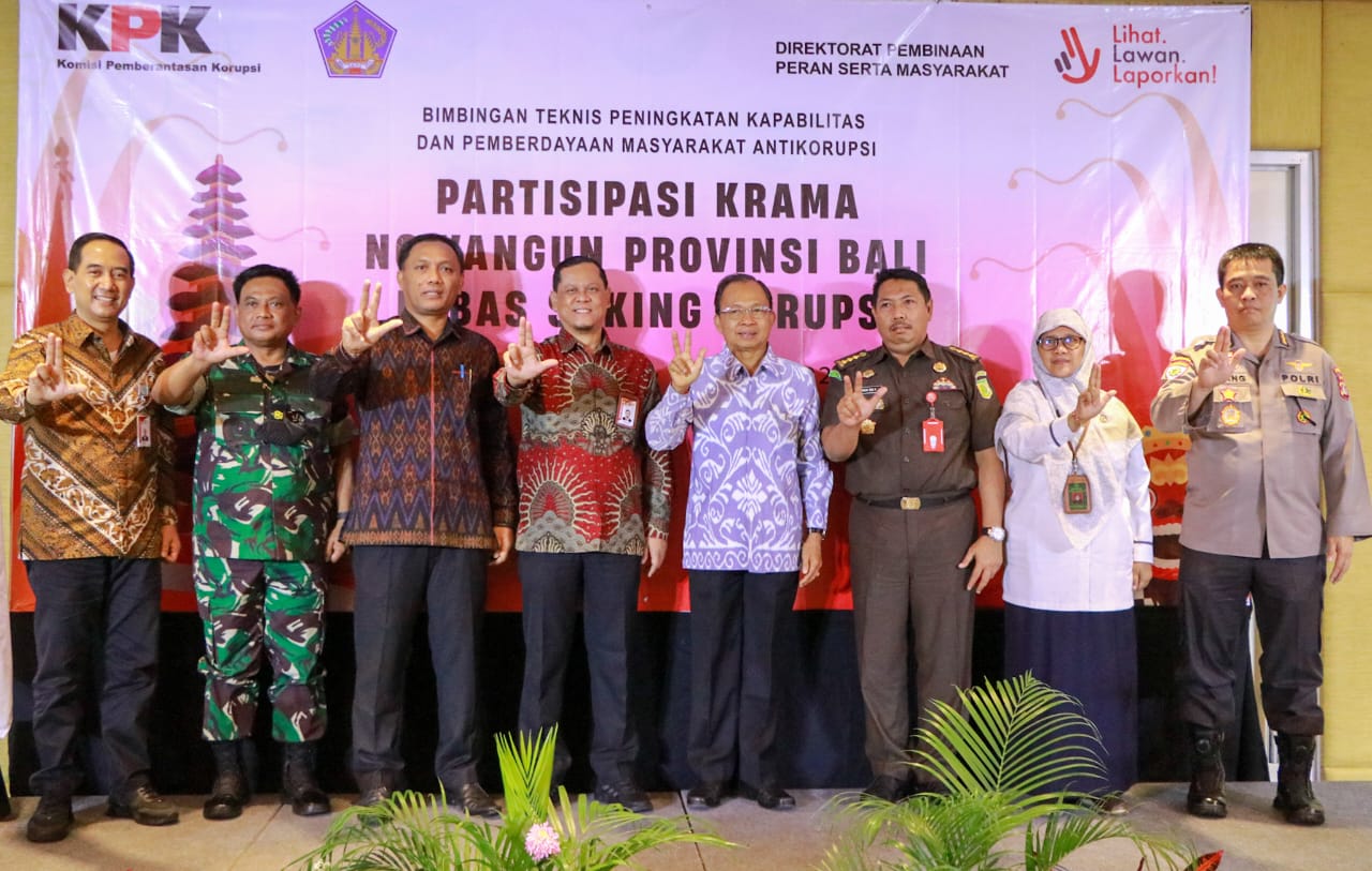 Dalam sambutannya, Gubernur Bali Wayan Koster menyampaikan Bimtek Peningkatan Kapabilitas dan Pemberdayaan Masyarakat Antikorupsi yang diselenggarakan oleh KPK sangat sejalan dengan Pemerintah Provinsi Bali sesuai dengan visi Nangun Sat Kerthi Loka Bali melalui Pola Pembangunan Semesta Berencana menuju Bali Era Baru, yang mengandung makna menjaga kesucian dan keharmonisan alam Bali beserta isinya, untuk mewujudkan kehidupan krama Bali yang sejahtera dan bahagia, Sakala-Niskala menuju kehidupan krama dan gumi Bali sesuai dengan prinsip Trisakti Bung Karno: Berdaulat secara Politik, Berdikari secara Ekonomi, dan Berkepribadian dalam Kebudayaan melalui pembangunan secara terpola, menyeluruh, terencana, terarah, dan terintegrasi dalam bingkai Negara Kesatuan Republik Indonesia berdasarkan Nilai-Nilai Pancasila 1 Juni 1945.