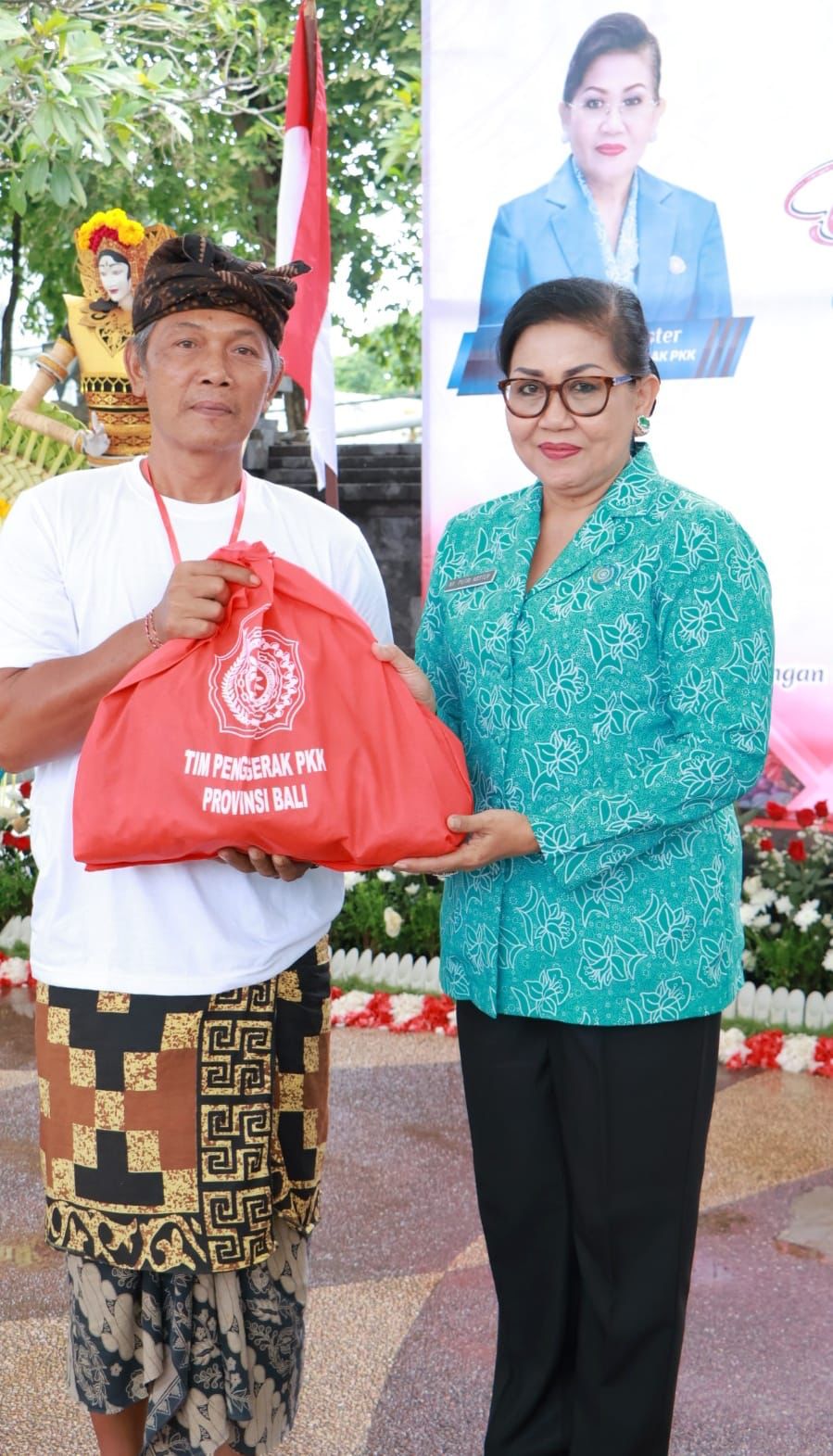 Pada kesempatan ini Ketua Tim Penggerak PKK Provinsi Bali Ny. Putri Koster yang bersinergi dengan Ketua TP PKK Kabupaten/ Kota se-Bali dan Ketua PAKIS Bali menyerahkan paket kepada 100 penerima manfaat masing-masing memperoleh empat (4) Tas, yang terdiri dari satu (1) tas yang berisi 1 bungkus beras 5 kg, telur 1 krat, 1 botol tanggung minyak goreng dari Ketua TP PKK Provinsi Bali, satu (1) tas yang berisi barang belanjaan sayur sayuran, bumbu dapur dan hasil olahan (makanan/camilan dan hasil olahan lainnya) pemberian dari Ketua dan Pengurus TP PKK Provinsi Bali, satu (1) tas yang berisi barang belanjaan pemberian dari TP PKK Kabupaten/Kota se-Bali dan satu (1) tas paket pemberian dari Ketua PAKIS Bali dan Dinas Pertanian Kota Denpasar.