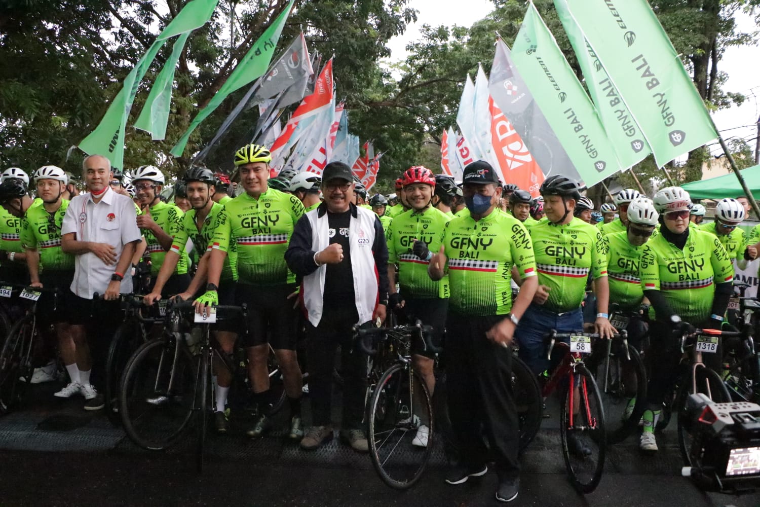 Pelepasan peserta GNFY Bali 2022 oleh Wagub Cok Ace disaksikan oleh Sekretaris Jenderal Pengurus Besar Ikatan Sport Sepeda Indonesia (Sekjen PB ISSI) Parama Nugroho dan Direktur Poltekpar Bali, Drs. Ida Bagus Putu Puja, M.Kes.(CF/HpB)