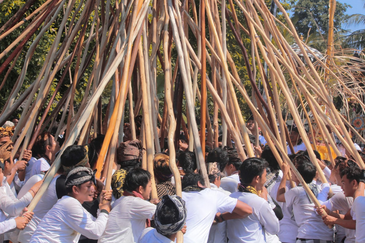 Warga kemudian terbagi dalam beberapa kelompok. Di setiap pertigaan yang dilewati masing masing kelompok yang terdiri dari 50 orang akan membuat bentuk segitiga menggabungkan kayu-kayu tersebut hingga berbentuk kerucut lalu mereka berputar, berjingkrak dengan iringan gamelan. Pada saat yang tepat seorang yang dianggap punya nyali sekaligus punya kaul akan mendaki puncak piramid dan melakukan atraksi entah mengangkat tongkatnya atau berdiri dengan mengepalkan tangan, sambil berteriak laksana panglima perang mengkomamdoi prajuritnya untuk terus menerjang musuh lalu kemudian ditabrakkan dengan kelompok yang mendirikan tumpukan kayu yang lain. Sesampai di sumber air, tameng suci, segala perangkat upacara yang dibawa dari Pura Dalem diberi tirta air suci dan dibersihkan. Kemudian mereka melakukan pawai kembali ke Pura Dalem untuk menyimpan semua perangkat yang dibawa berkeliling tadi. (Sy/Google)