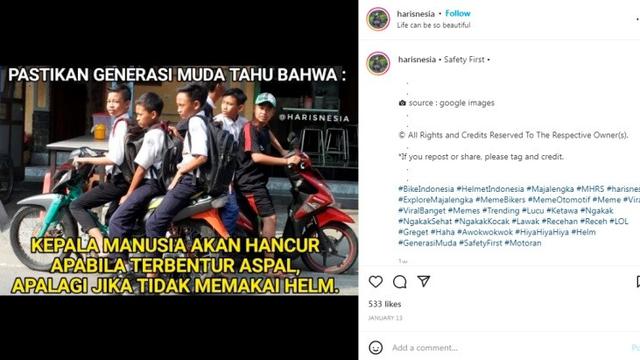 Meme tersebut memiliki pesan yang mendalam. Lewat sebuah foto, dimana sekelompok anak remaja yang tak lain anak sekolah, naik motor bonceng tiga namun tidak mengenakan helm.
