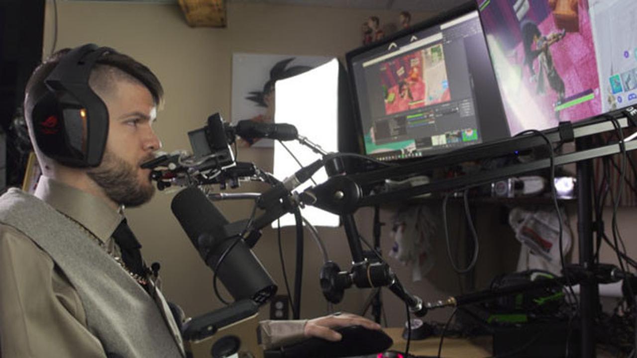 Untuk bermain gim, RockyNoHands mengandalkan Quadstick–perangkat yang dikendalikan menggunakan mulutnya.