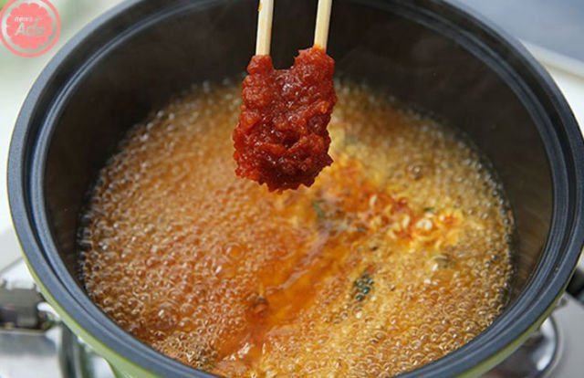 2. Panaskan kaldu ayam dan tambahkan gochujang, bubuk cabai, kecap asin, gula, dan bumbu mi