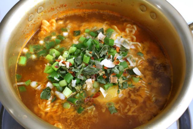 7. Jika sudah dirasa cukup, matikan api, angkat panci dari kompor dan tambahkan nori. Mi sudah bisa disantap di panci tanpa harus kamu pindahkan