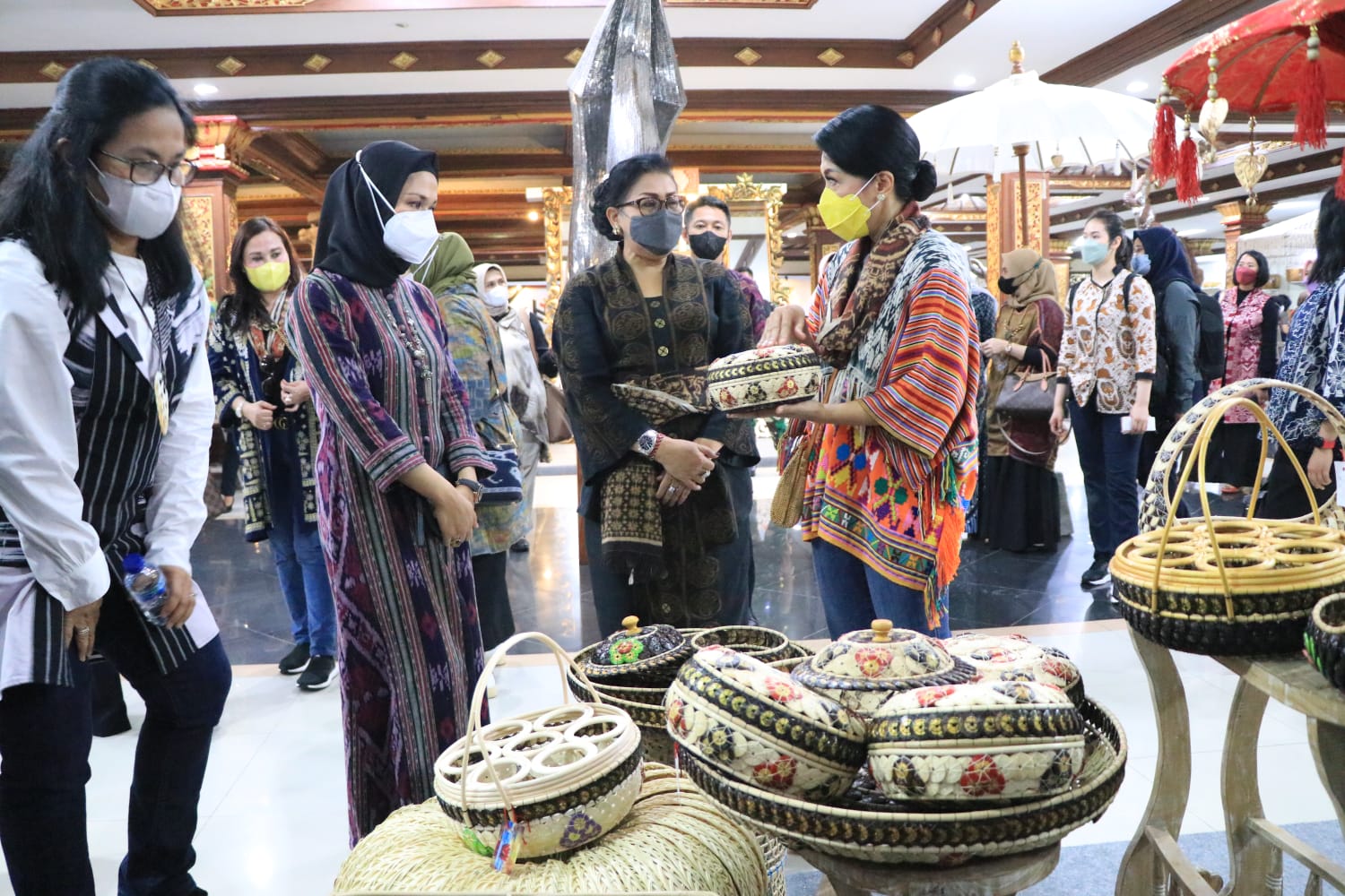 BALIPUSTAKANEWS,DENPASAR – Setelah sehari sebelumnya dikunjungi rombongan delegasi Inter-Parliamentary Union (IPU) Assembly & Related Meetings, Rabu (23/3/2022), Pemeran IKM Bali Bangkit di Taman Budaya Provinsi Bali mendapat kunjungan dari rombongan Dharma Pertiwi Pusat. Rombongan dipimpin langsung oleh Istri Panglima TNI selaku Ketua Umum Dharma Pertiwi Ny. Hetty Andika Perkasa. Kedatangan istri Panglima TNI disambut langsung oleh Ketua Dewan Kerajinan Nasional Daerah (Dekranasda) Provinsi Bali Ny. Putri Koster dengan penyerahan buket bunga.