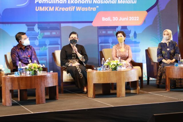 BALIPUSTAKANEWS,BADUNG – Ketua Dekranasda Provinsi Bali Ny. Putri Koster sebagai Narasumber Pada Forum Digital Kemenkominfo RI “Bersama Dekranas Mendorong Percepatan Pemulihan Ekonomi Nasional Melalui UMKM Kreatif Wastra”, di Sheraton Bali Kuta Resort-Badung, Wraspati Paing Medangsia (Kamis, 30/6/2022).