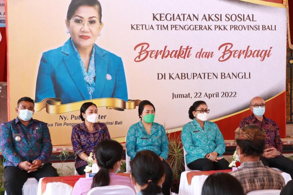 Pendamping orang nomor satu di Bali ini juga menyampaikan bahwa kegiatan aksi sosial berbakti dan berbagi pada pagi hari ini tidak hanya semata mata bertujuan untuk memberikan bantuan tetapi lebih penting lagi dalam aksi sosial ini turun langsung ke lapangan dan melihat langsung kondisi masyarakat, berbakti dan berbagi menyentuh masyarakat langsung seperti Balita Gizi buruk / kurang gizi, ibu hamil kekurangan energi kronis (KEK) , para lansia , penyandang disabilitas serta kader PKK yang semuanya bertujuan untuk membantu dan meringankan beban masyarakat.