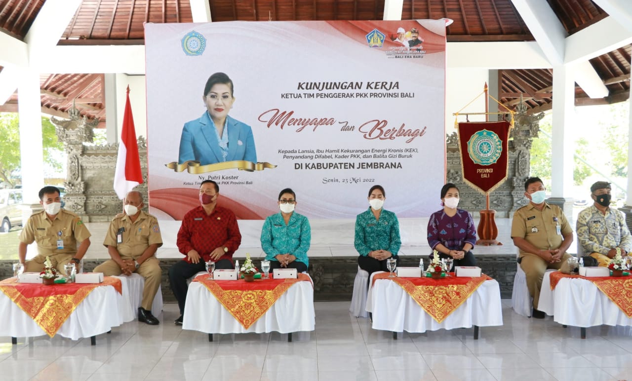 BALIPUSTAKANEWS,JEMBRANA – Ketua TP PKK Provinsi Bali Ny. Putri Suastini Koster didampingi Kepala Dinas Kehutanan dan Lingkungan Hidup Provinsi Bali I Made Teja dan Kepala Dinas Pemberdayaan Masyarakat Desa, Kependudukan dan Catatan Sipil Provinsi Bali Putu Anom Agustina melaksanakan kegiatan menyapa dan berbagi di wilayah Kabupaten Jembrana, Senin (23/5/2022). Kegiatan sosial dilaksanakan di dua lokasi yaitu Wantilan Pura Dang Kahyangan Rambut Siwi, Desa Yehembang Kangin, Kecamatan Mendoyo dan Wantilan Pura Dang Kahyangan Perancak, Desa Perancak, Kecamatan Jembrana. Sasaran kegiatan sosial ini adalah kelompok masyarakat yang membutuhkan uluran tangan seperti lansia, difabel, balita gizi buruk / kurang gizi dan ibu hamil kekurangan energi kronis (KEK).