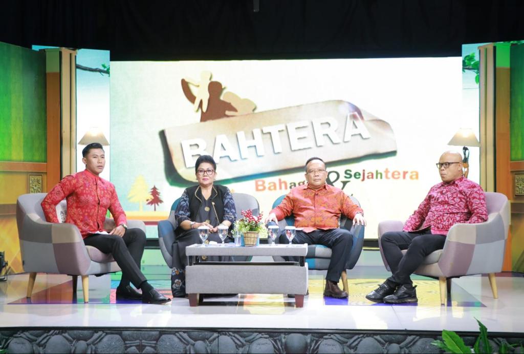 BALIPUSTAKANEWS, DENPASAR – Ketua Tim Penggerak PKK Provinsi Bali, Ny. Putri Koster kembali menyapa masyarakat Bali untuk mensosialisasikan capaian program kerja Pemerintah Provinsi Bali yang dipimpin oleh Gubernur Koster. Dalam Dialog Interaktif BAHTERA, Bahagia dan Sejahtera yang disiarkan langsung oleh TVRI Bali, Rabu (Buda Pon, Bala), 12 April 2023, Ny. Putri Koster bersama dengan Kelompok Ahli Pembangunan Pemerintah Provinsi Bali Prof. I Made Damriyasa dan Prof. I Wayan Adnyana mensosialisasikan 44 Tonggak Peradaban Penanda Bali Era Baru khususnya terkait 44 Tonggak Peradaban Penanda Bali Era Baru