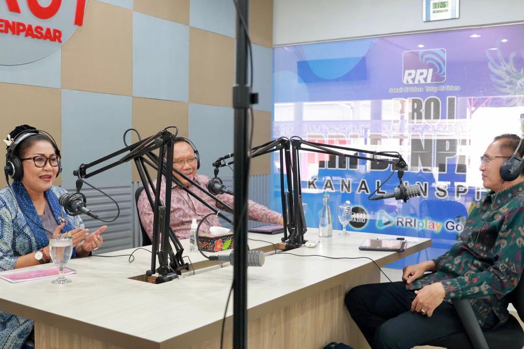 BALIPUSTAKANEWS, DENPASAR – Ketua TP PKK Provinsi Bali Ny. Putri Koster berkesempatan menjadi narasumber dalam program Dialog Denpasar Siang Ini dengan tema “44 Tonggak Peradaban Penanda Bali Era Baru, Memuliakan Bahasa, Kasara, dan Sastra Bali” bersama dengan Koordinator Kelompok Ahli Bidang Pembangunan Pemerintah Provinsi Bali Prof. Dr. drh. I Made Damriyasa, M.S. dan Kelompok Ahli Bidang Agama, Adat, Tradisi, Seni dan BUdaya Drs. Gede Nala Antara, M.Hum, bertempat di Studio RRI Denpasar, Denpasar pada Senin (8/5/2023).