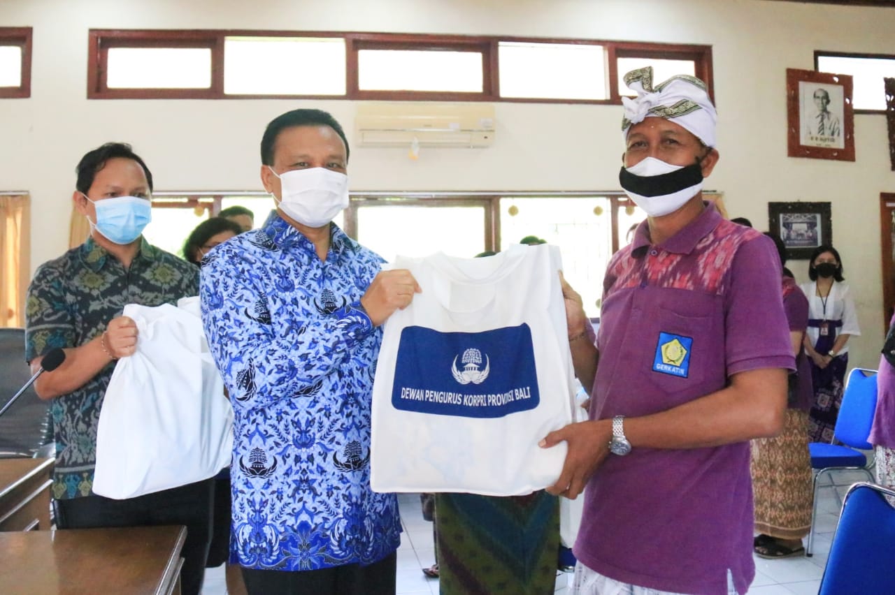 BALIPUSTAKANEWS,DENPASAR – Sekretaris Daerah Provinsi Bali yang juga selaku Ketua Dewan Pengurus Korps Pegawai Republik Indonesia (KORPRI) Bali Dewa Made Indra menyerahkan bantuan berupa 1.000 paket sembako dan 28 buah kursi roda kepada kelompok penyandang disabilitas, Jumat (19/11/2021). Bertepatan dengan momentum penampahan Kuningan, penyaluran bantuan ini dilaksanakan dalam rangka memperingati HUT ke-50 KORPRI Tahun 2021 yang puncaknya jatuh pada tanggal 29 Nopember mendatang.