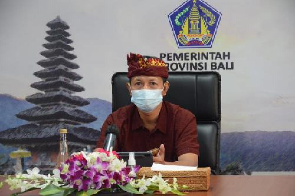 Gubernur Bali yang diwakili Kepala Biro Organisasi Setda Provinsi Bali I Wayan Serinah mengikuti kegiatan secara online dari Ruang Press Room Kantor Gubernur Bali.