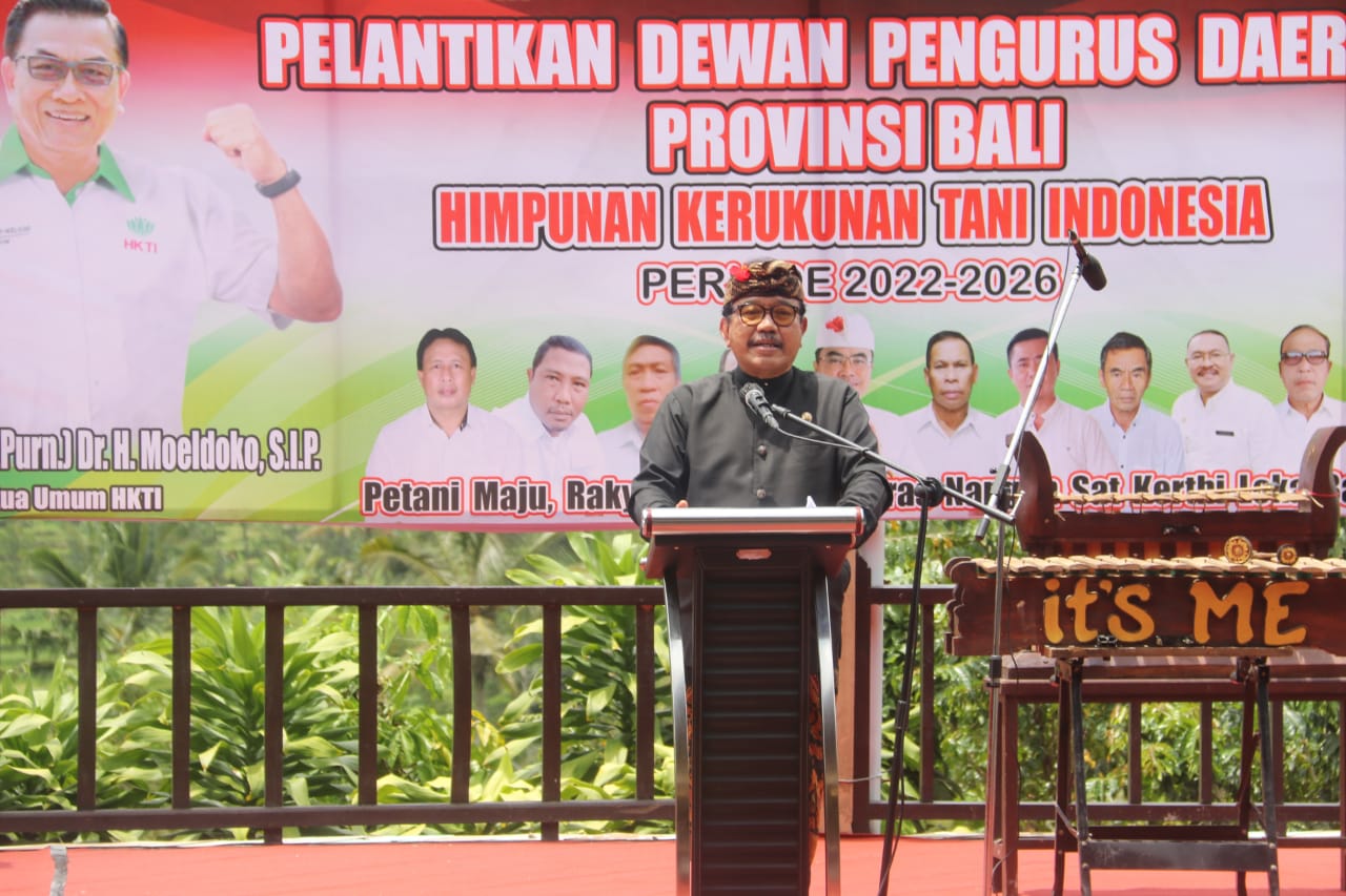BALIPUSTAKANEWS,TABANAN – Himpunan Kerukunan Tani Indonesia (HKTI) Bali sebagai mitra pemerintah daerah diharapkan dapat meningkatkan prestasi dan kinerja organisasi dalam rangka membantu pemerintah pusat dan pemerintah daerah menyukseskan program prioritas jangka pendek pembangunan di daerah Bali melalui pola pembangunan semesta berencana mewujudkan Bali Era Baru melalui Visi Nangun Sat Kerthi Loka Bali. Dimana dalam misi yang menjadi arah kebijakan pembangunan Bali, berfokus kepada hal untuk memastikan terpenuhinya kebutuhan pangan, sandang, dan papan dalam jumlah dan kualitas yang memadai bagi kehidupan krama Bali. Hal ini disampaikan Wakil Gubernur Bali Prof. Tjok. Oka Artha Ardhana Sukawati dalam sambutannya saat menghadiri pelantikan Ketua DPD HKTI Provinsi Bali, di The Lava Mountain Club, Jatiluwih-Tabanan, Minggu (30/1).