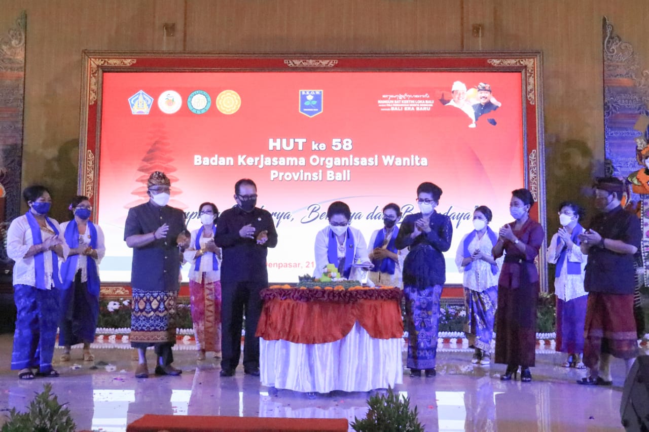Sementara itu, Ketua Umum BKOW Bali Ny. Tjokorda Putri Hariyani Ardhana Sukawati (Ny. Cok Ace) dalam sambutannya mengajak para perempuan mengingat kembali spirit emansipasi RA. Kartini. Ia menambahkan, sosok perempuan memiliki peran yang sangat penting dalam pembangunan khususnya di tengah situasi pandemi Covid-19. Kebiasaan baru di tengah pandemi seperti penerapan protokol kesehatan dan belajar dari rumah membutuhkan peran aktif perempuan sebagai sosok ibu. Pada bagian lain, Ny. Cok Ace melaporkan rangkaian kegiatan memperingati HUT BKOW ke-58 yaitu persembahyangan ke sejumlah pura, pemberian bantuan bagi penyandang disabilitas, pembinaan petani jahe di Bangli, pelatihan tata rias dan pasar murah. “Kami juga melaksanakan kegiatan peduli satwa dengan pemberian makan bagi kera di Alas Kedaton,” imbuhnya. Mengakhiri sambutannya, ia menyampaikan terima kasih pada semua pihak yang telah mendukung suksesnya peringatan HUT ke-58 BKOW Bali.