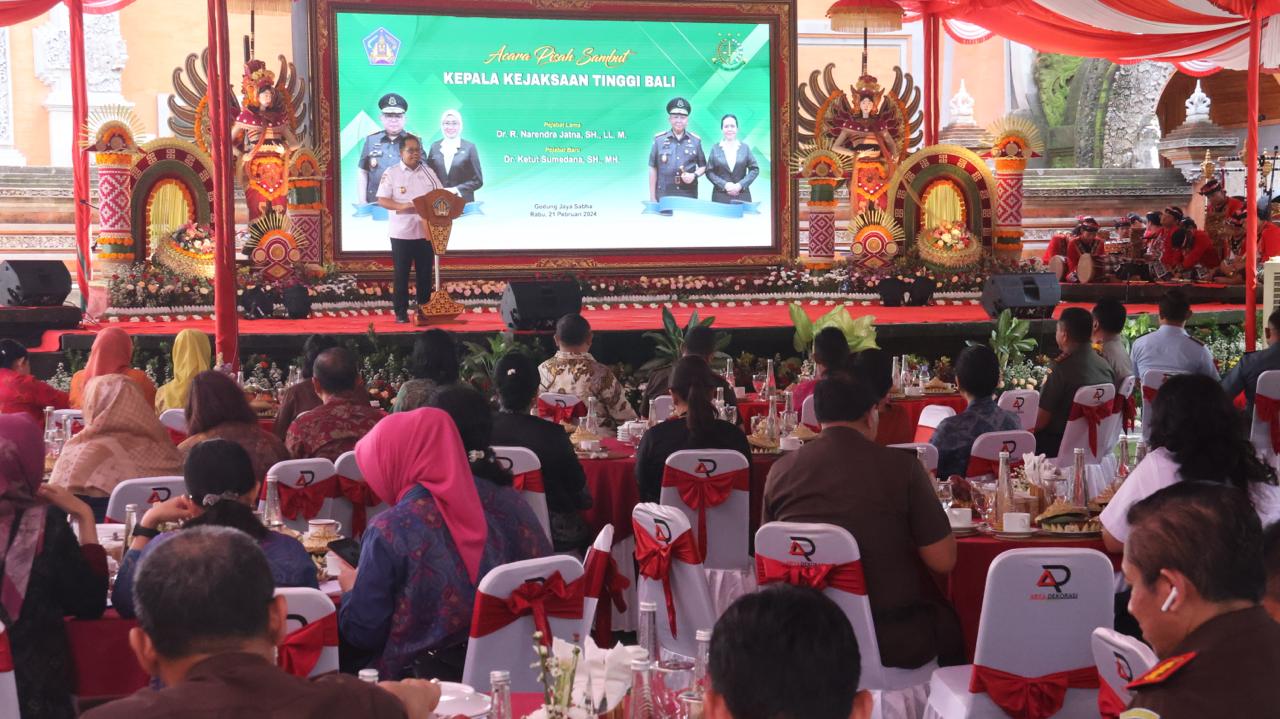 Mengawali sambutannya, Pj. Gubernur Bali mewakili Forkopimda, Bupati/Walikota dan masyarakat Bali mengucapkan terima kasih kepada Narendra Jatna beserta Ibu, atas kerjasama yang baik dan sumbangsihnya kepada Bali, sekaligus mengucapkan selamat atas promosi jabatan menjadi Kepala Kejaksaan Tinggi DKI Jakarta.