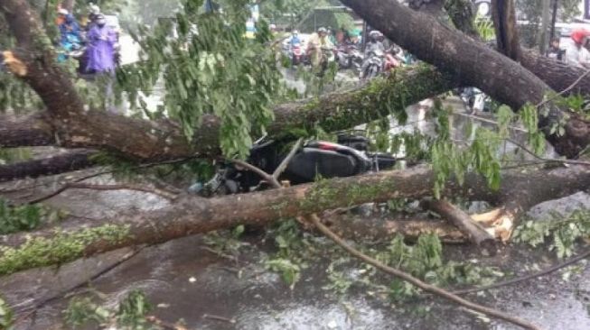 “Ya betul, ada pengendara yang tertimpa pohon tumbang saat melintas ketika hujan deras mengguyur di lokasi kejadian,” kata Iptu Gede Gisiyasa.