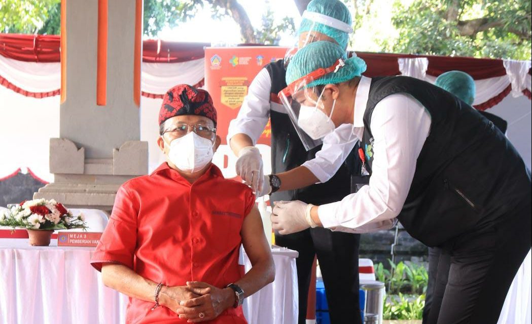 DENPASAR, BALIPUSTAKANEWS – Setelah Presiden RI, Joko Widodo menerima suntikan vaksin Covid-19 dosis kedua pada, Rabu (27/1) pagi di Istana Merdeka, Jakarta. Selanjutnya kegiatan vaksinasi Covid-19 yang bertujuan untuk membentuk kekebalan kelompok, hingga melindungi dan memperkuat sistem kesehatan ini juga dilakukan oleh Gubernur Bali, Wayan Koster bertepatan pada Purnama Kaulu, Hari Kamis, Wraspati Wage Watugunung (28/1) pagi di Wantilan Kertha Sabha, Jayasabha, Denpasar.