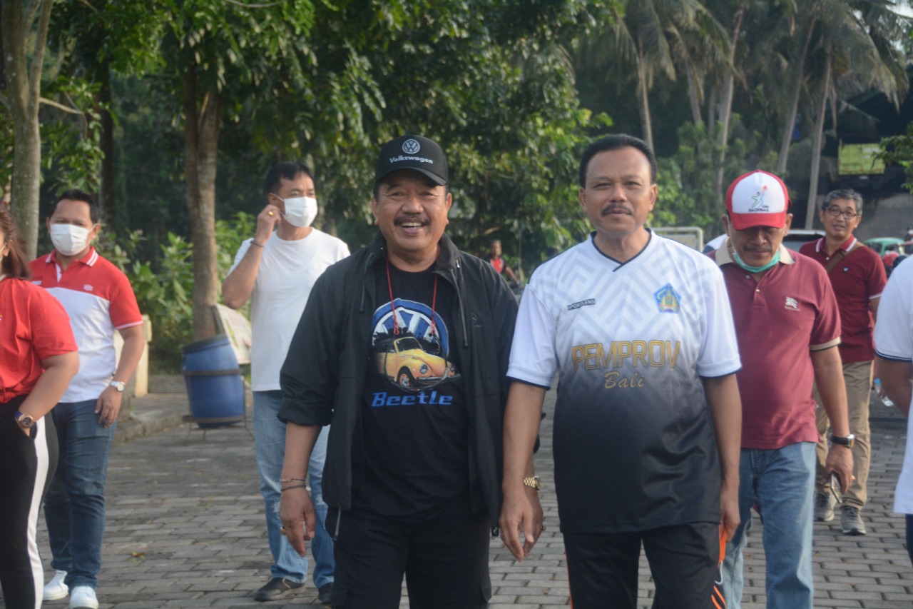BALIPUSTAKANEWS,GIANYAR – Wakil Gubernur Bali Tjokorda Oka Artha Ardhana Sukawati bersama Seketaris Daerah Provinsi Bali Dewa Made Indra menghadiri dan sekaligus melalukam tendangan pembuka dalam kegiatan Persatuan Sepak Bola Pegawai Pemprov Bali (PSP) Friendly Match Road Kab/Kota se-Bali, yang kali ini bertandang ke Kabupaten Gianyar melawan Pemkab Gianyar FC di Lapangan Wenara Mandala Monkey Forest – Ubud, Gianyar, Bali Tanggal 5 Mei 2022.